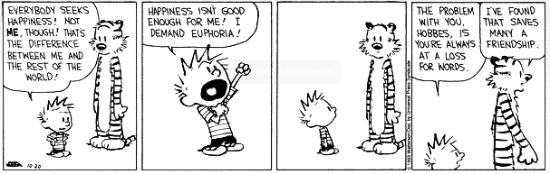 “Everybody seeks happiness! Not me, though! That’s the difference between me and the rest of the world. Happiness isn’t good enough for me! I demand euphoria!”